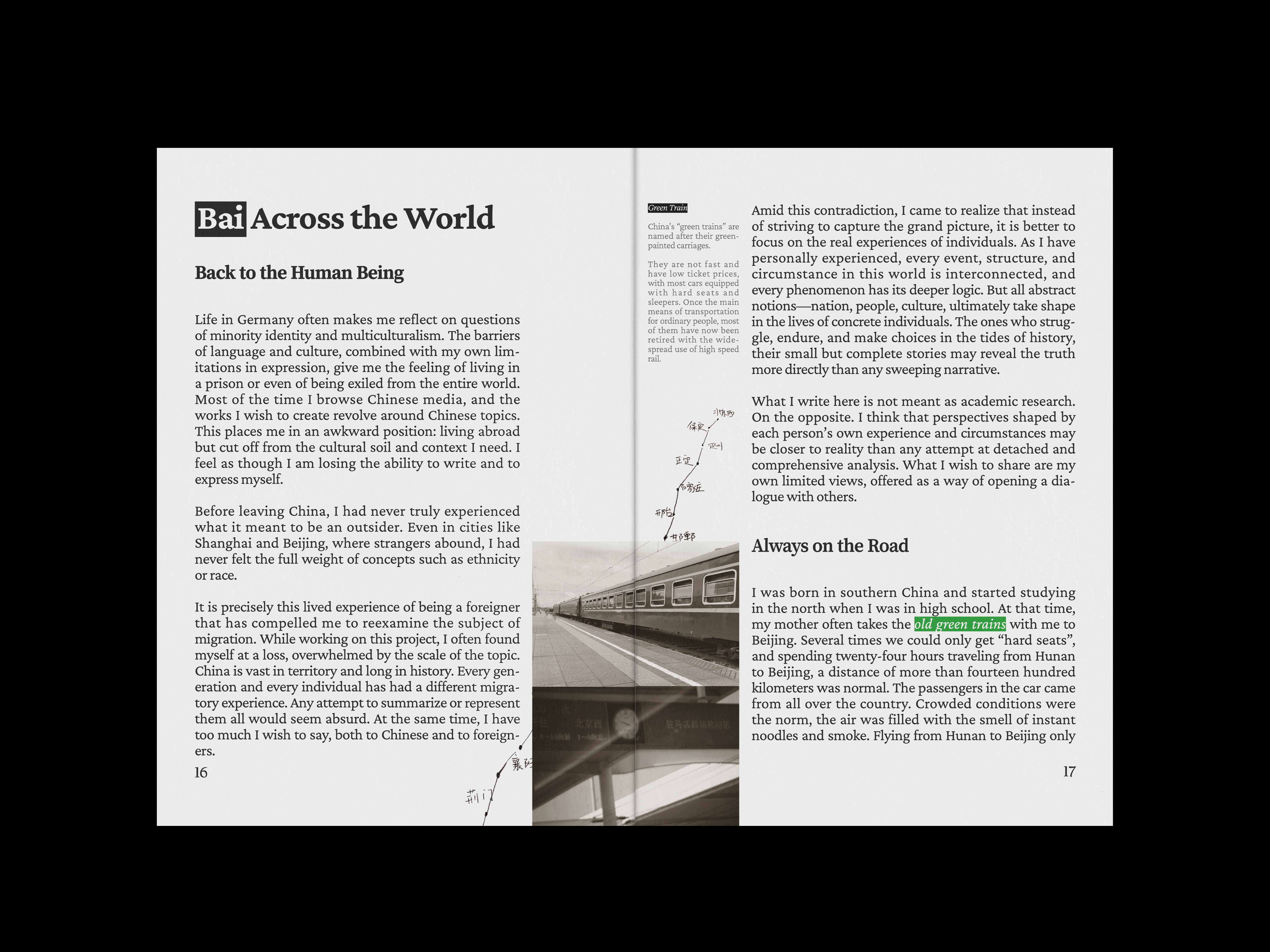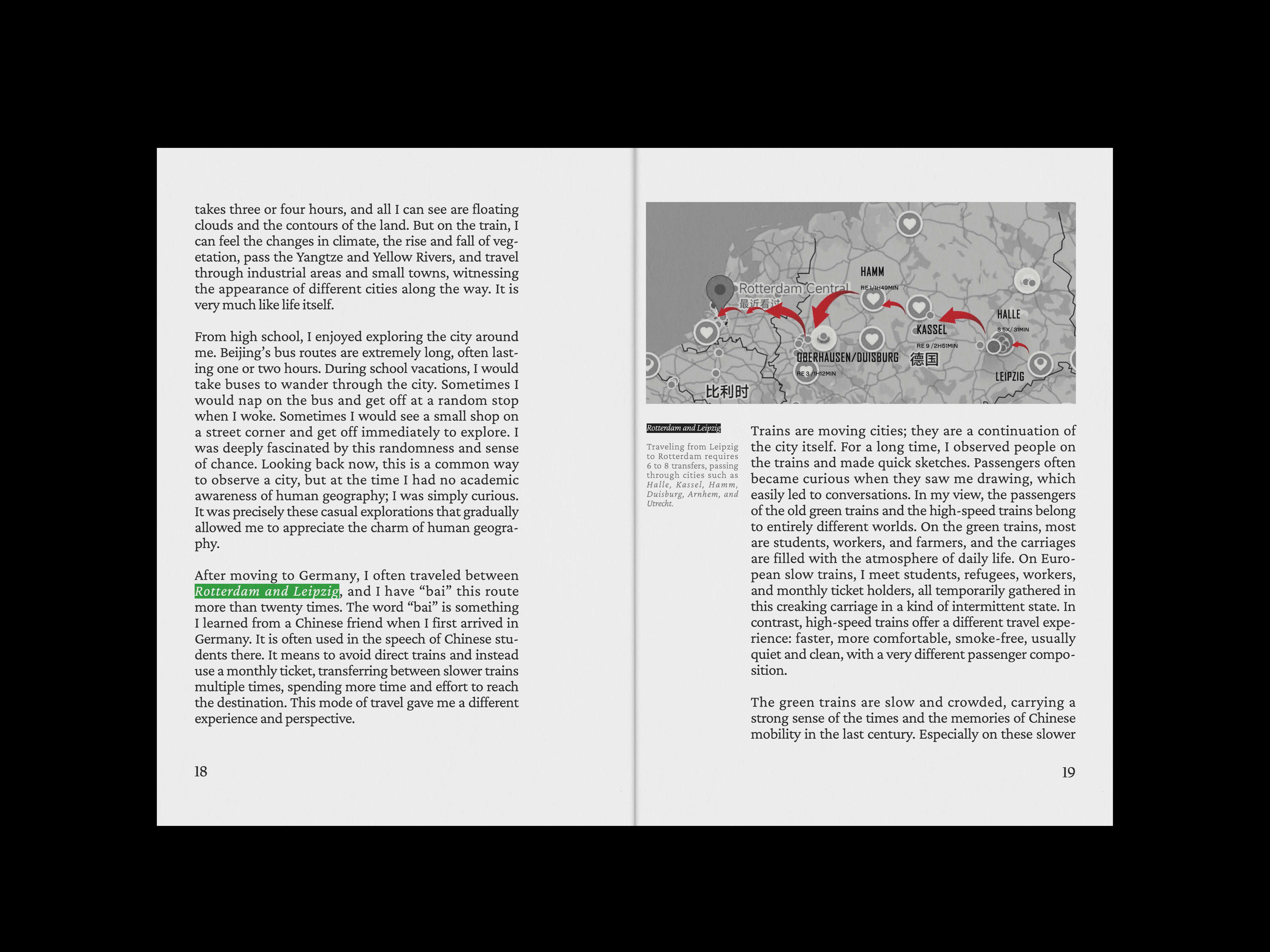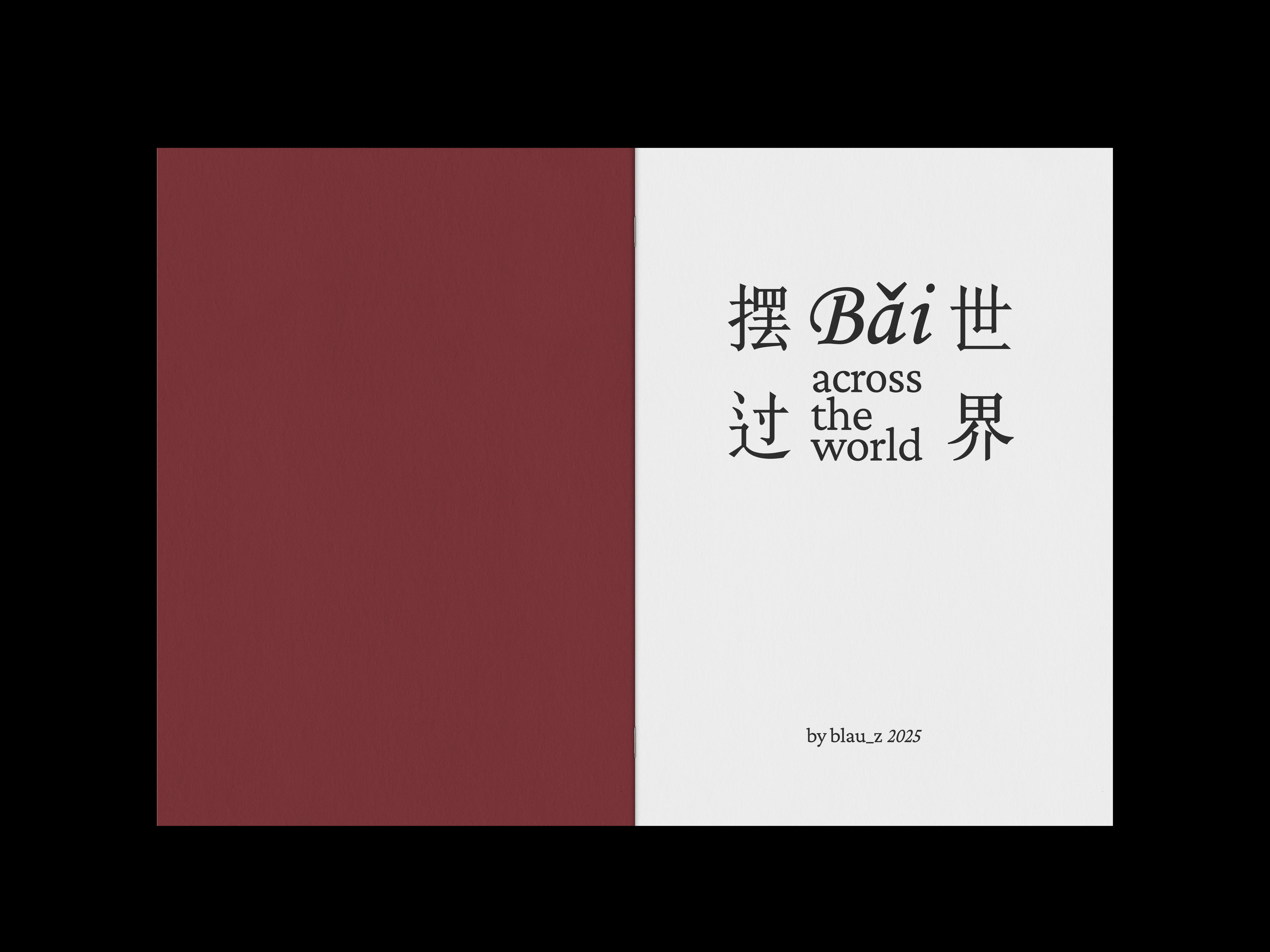 The main concept comes from the word "摆" (Bǎi). In Chinese, it originally means "to place" or "to sway." However, the word has a new meaning among Chinese people in Germany, referring to the act of transferring between regional trains with the Deutschland-Ticket to reach a destination. It symbolizes migration, transition, and instability, which run throughout the entire project.