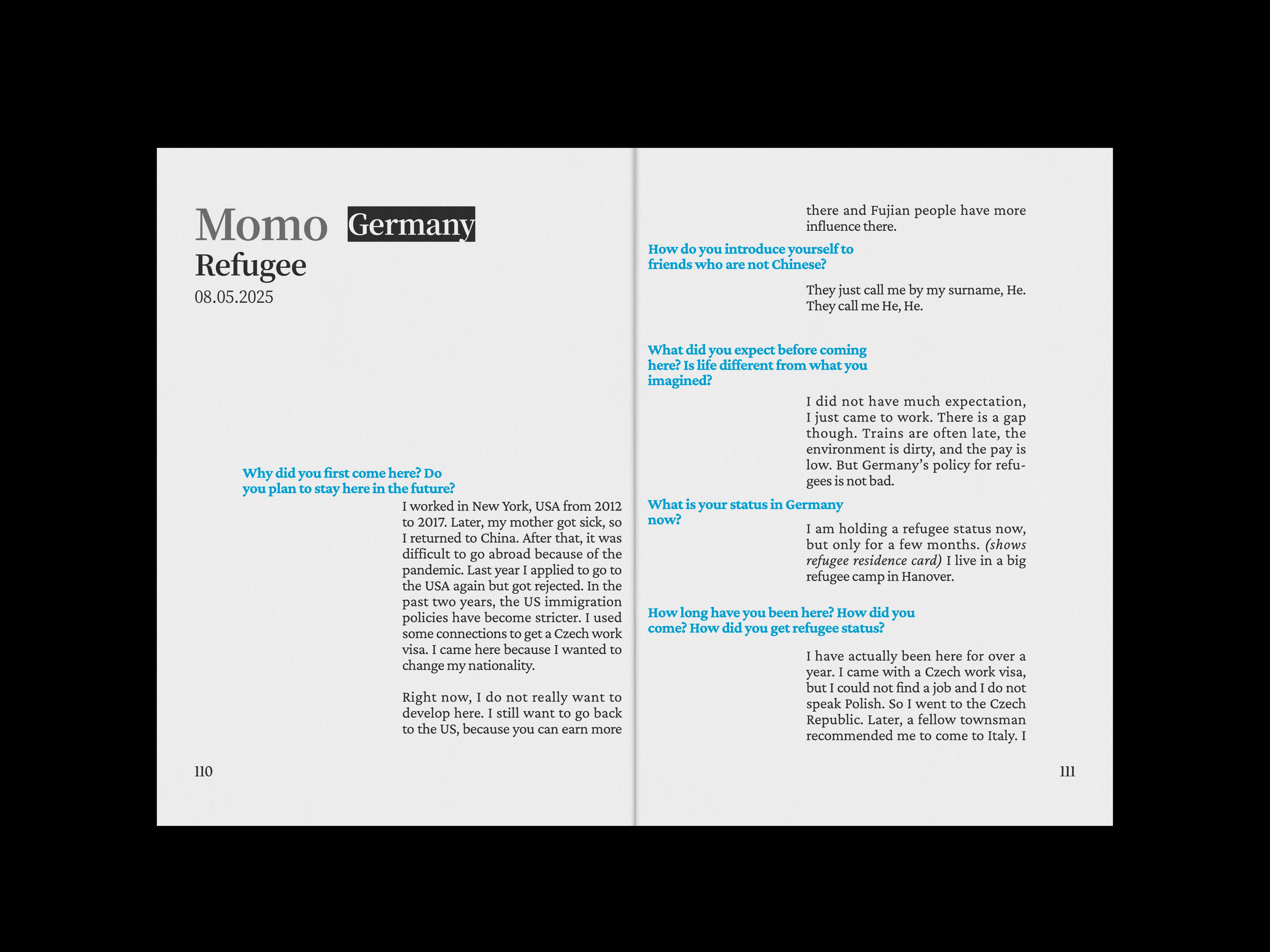 This project explores the lives of Chinese people living in Europe, through one conversation with each of 15 participants. This publication currently presents 10 stories from the interviews, documenting their daily lives, work, and sense of identity.