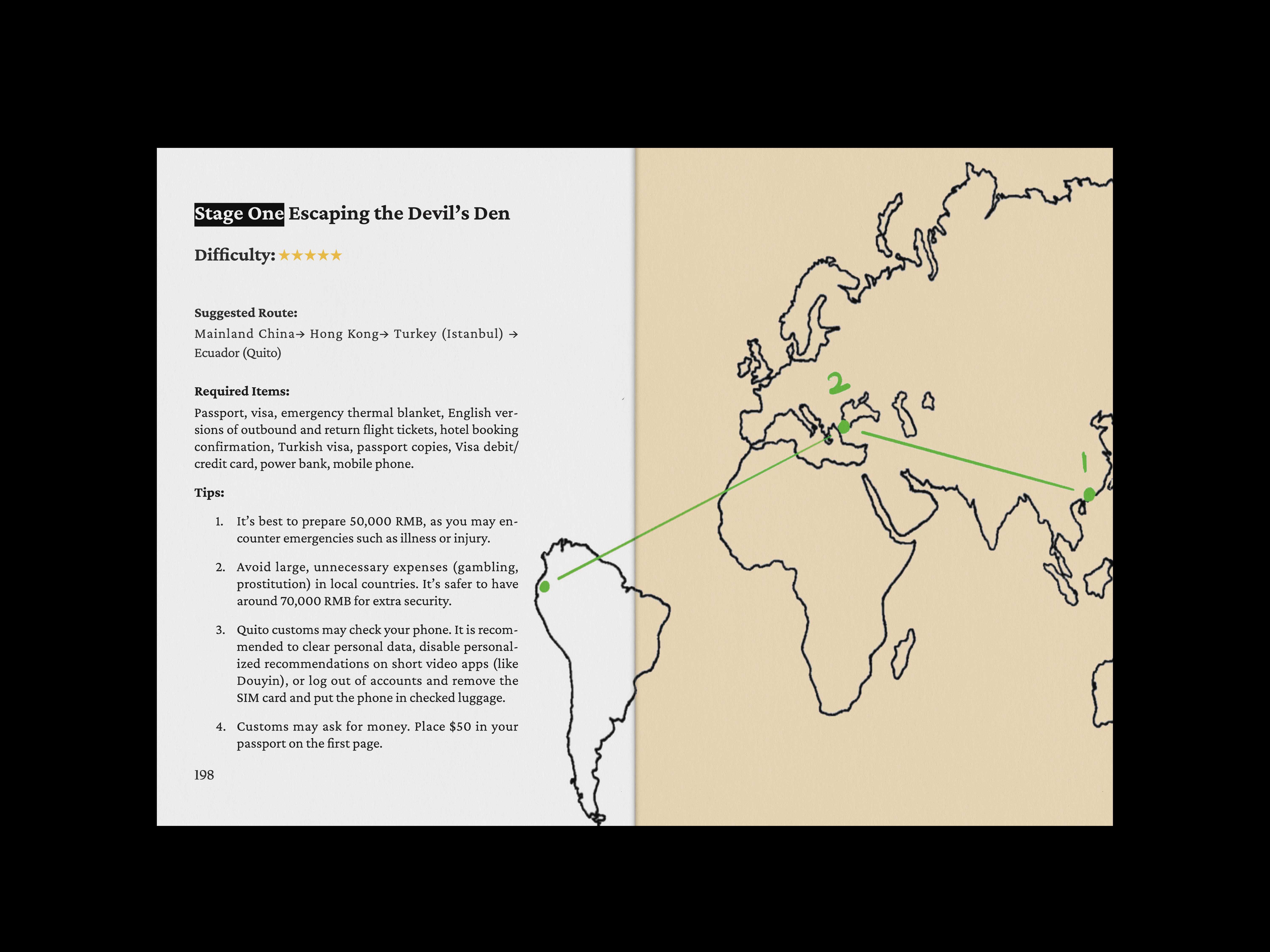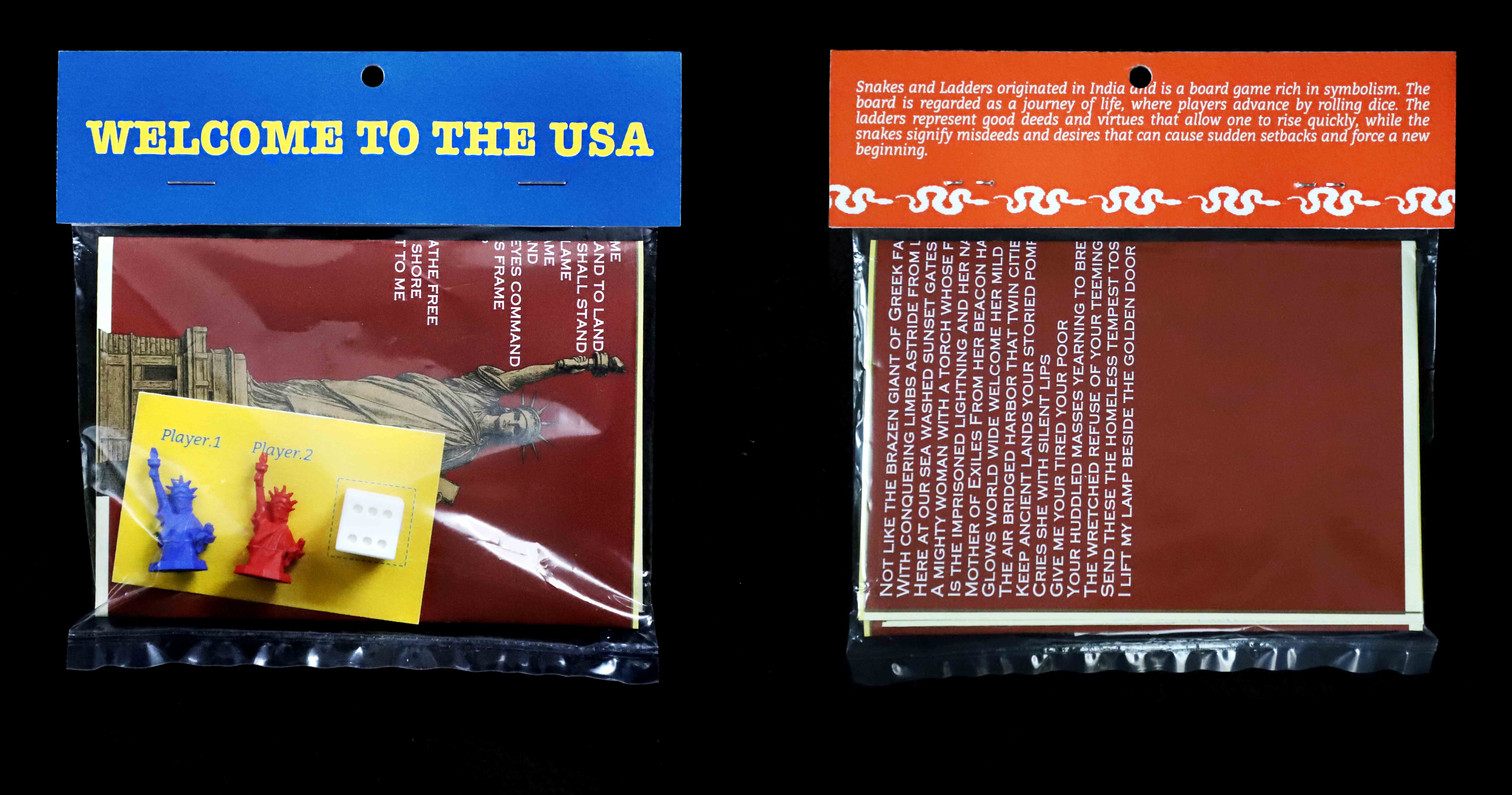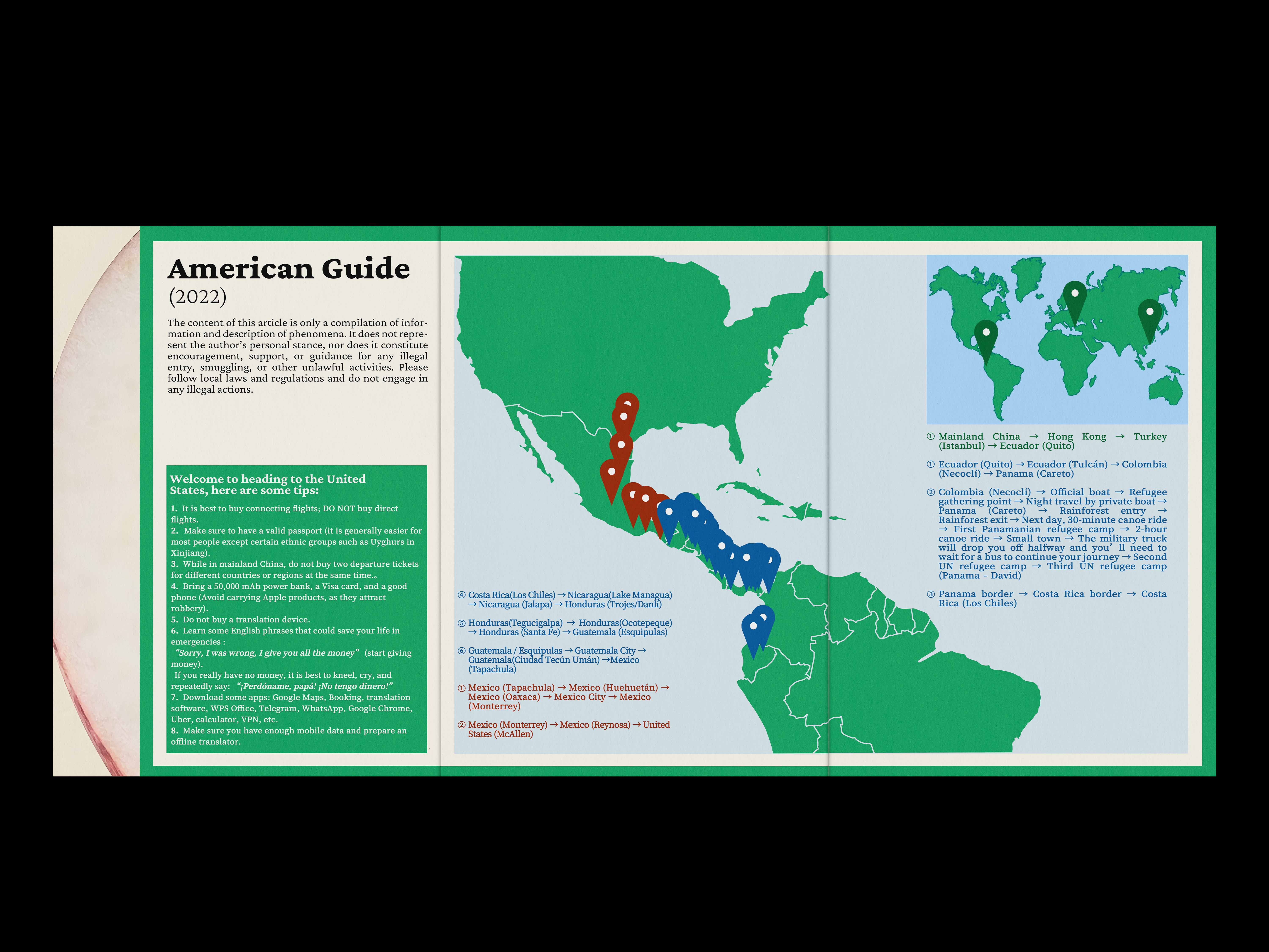 The final part "American Guide" was inspired by one interviewee. During the COVID-19 pandemic in 2022, he researched routes for leaving China and reaching the United States. He documented the real journeys and experiences of earlier Chinese migrants who sneaked into the U.S. on foot. Using the form of the traditional Indian game Snakes and Ladders, I transformed his findings into a board game where the final destination is "the United States."